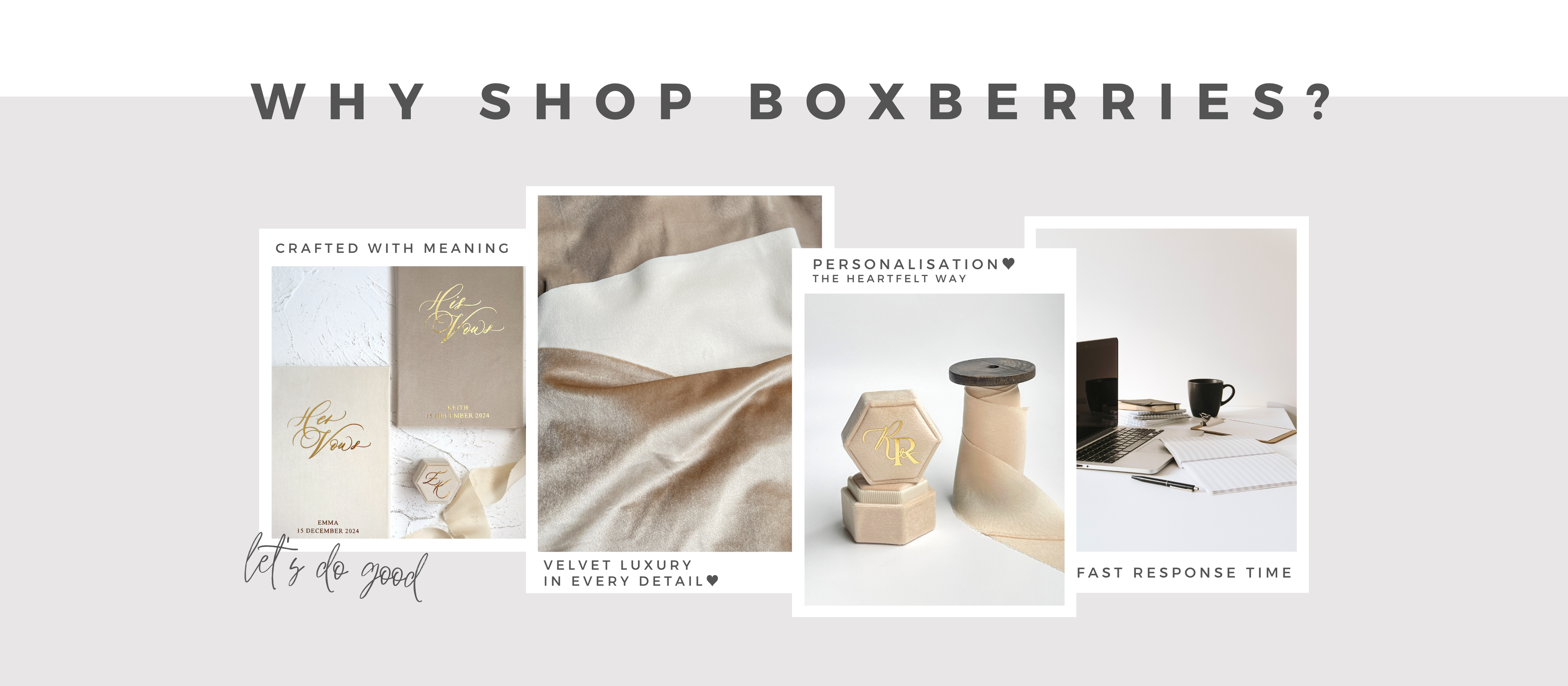 At Boxberries, we believe in the magic of rituals, the soft velvet touch of a vows book, the elegance of a personalised certificate holder, the quiet joy of details crafted with care. Born in Hong Kong, our studio offers handcrafted velvet keepsakes that celebrate commitment, milestones, and the art of remembering.