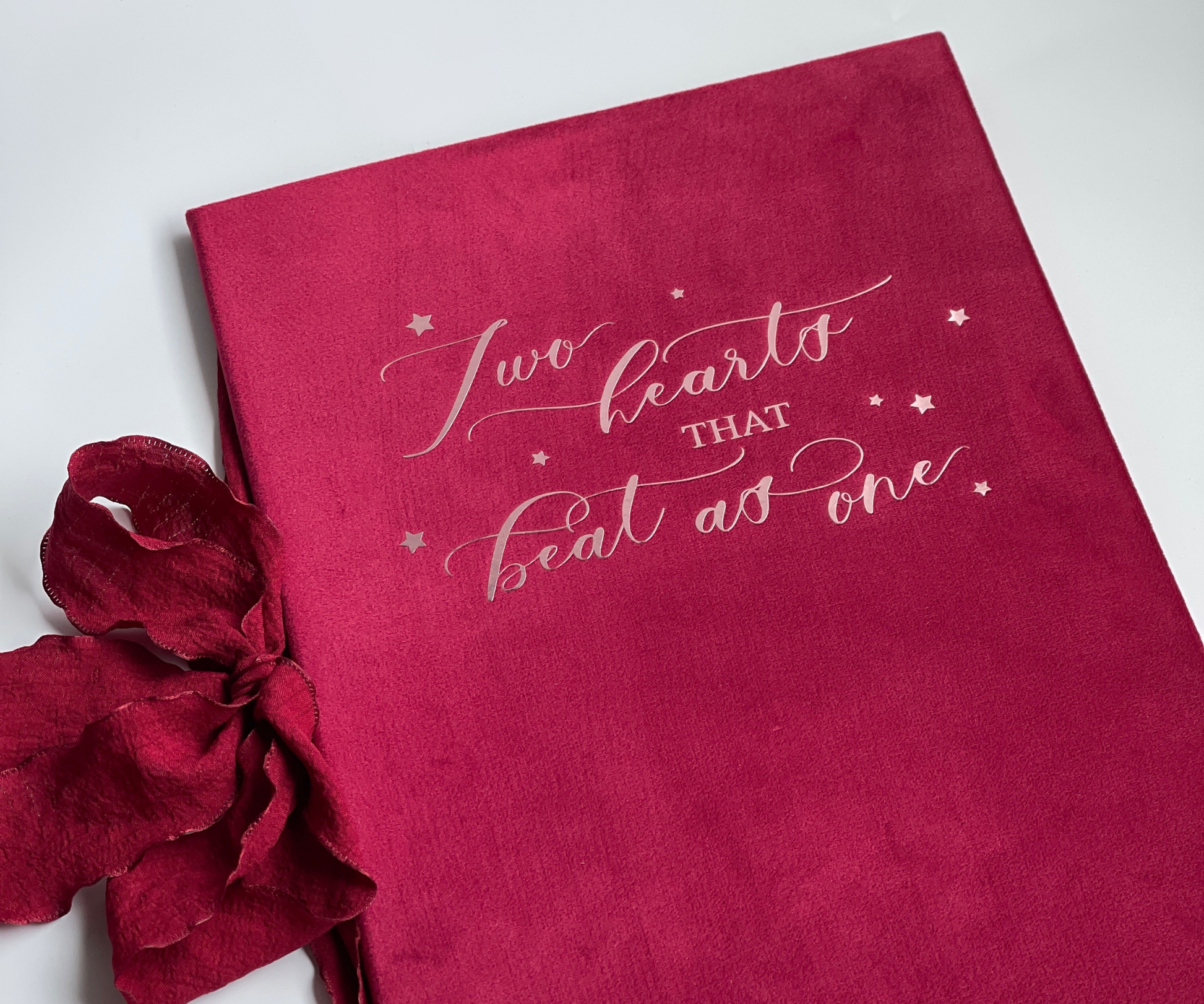 這款 現貨結婚證書套 選用我們人氣絲絨布色 Kara 桃紅,配以 玫瑰金燙印字句「Two hearts that beat as one」,溫柔記錄兩顆心的同步跳動與深刻承諾。